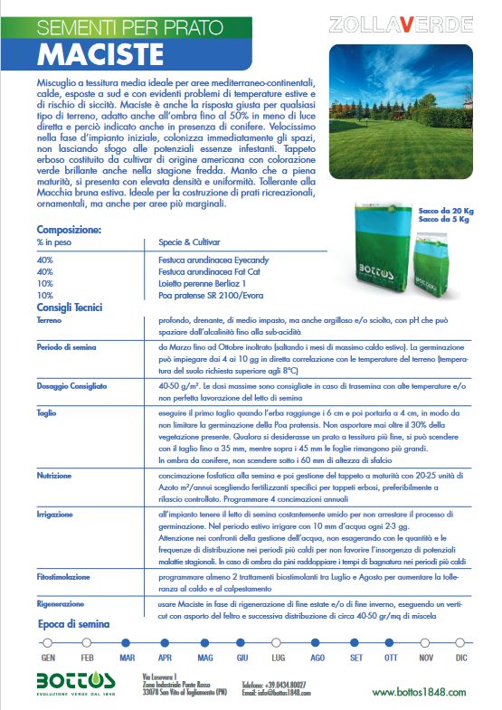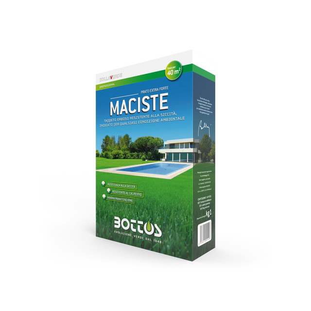 Mischung mit mittlerer Textur, ideal für mediterran-kontinentale Gebiete, warm, nach Süden ausgerichtet und mit offensichtlichen Problemen der Sommertemperaturen und der Dürregefahr. Maciste ist auch für jeden die richtige Antwort Bodenart, auch für Schatten geeignet mit bis zu 50 % weniger Licht direkt und daher auch in der Nähe von Nadelbäumen geeignet. Sehr schnell in der ersten Pflanzphase besiedelt es sofort die Räume, Nicht Verlassen entlüften bei Potenzial Essenzen Schädlinge. Teppich Grasartig, bestehend aus Sorten amerikanischen Ursprungs mit Farbe Auch in der kalten Jahreszeit leuchtend grün. So voll umhüllen Reife, präsentiert sich mit hoher Dichte und Gleichmäßigkeit. Tolerant gegenüber Sommerbrauner Fleck....