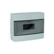 Centralino da parete 12 moduli con corpo grigio RAL 7035 e portello fumè. In tecnopolimero isolante non propagante la fiamma. Binario DIN in metallo.