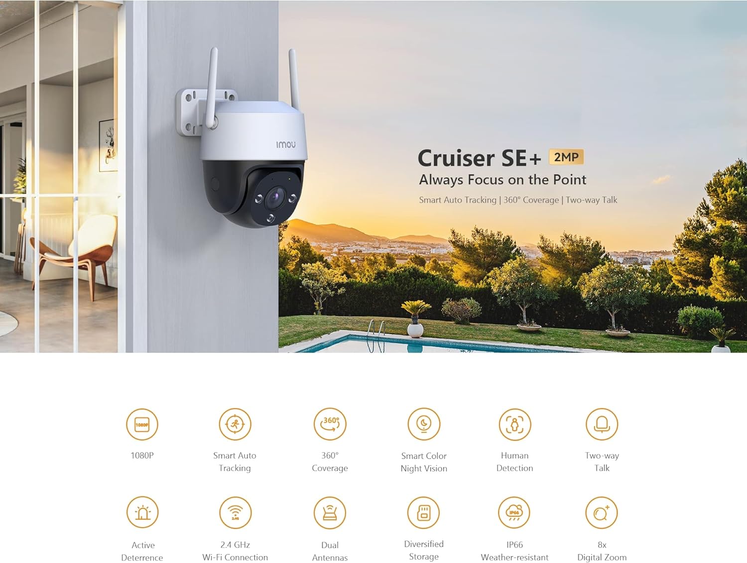 - IP66 wetterfest, Personenerkennung, Smart Tracking, PIR-Erkennung zur Vermeidung von Fehlalarmen, Vollfarb-Nachtsicht, bidirektionale Kommunikation