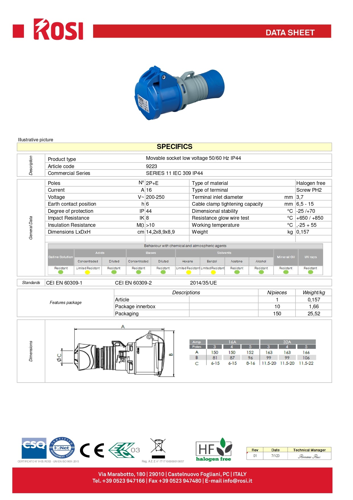 Industrielle fliegende Steckdose CEE 16A 2P+E 220V IP44 ROSI ist auf Lager und wird versandt, sobald es wieder verfügbar ist