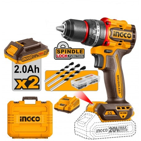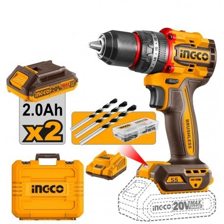 INGCO Trapano Avvitatore COMPACT con percussione 20V 55Nm BRUSHLESS con 2 batterie 2Ah