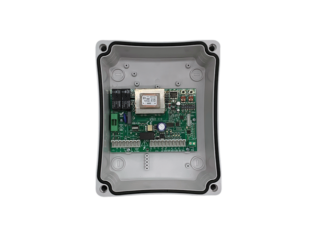 La centrale KEY AUTOMATION CT1RS è una centrale di comando 230 Vac per un motore per serranda o cancello scorrevole. Dotata di frizione elettronica, finecorsa e ricevente radio incorporata a 433,92 MHz con capacità di 120 trasmettitori. Fornita in box con grado di protezione IP54.