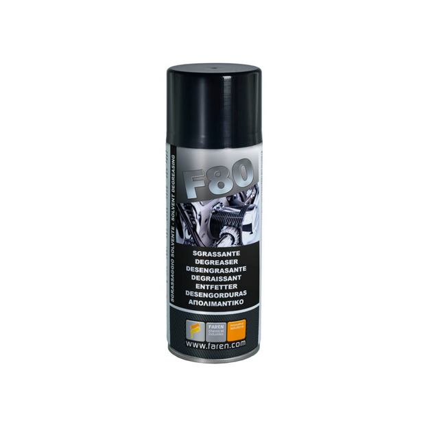 FAREN F 80 SOLVENT ENTFETTER SPRÜHFLASCHE ML. 400 F80 Referenz Cod. 1AB LÖSUNGSMITTELENTFETTER Zur schnellen Reinigung von Motoren, Vergasern, Farbwalzen und allen anderen Anwendungen, bei denen eine schnelle Reinigung kleiner Oberflächen erforderlich ist.