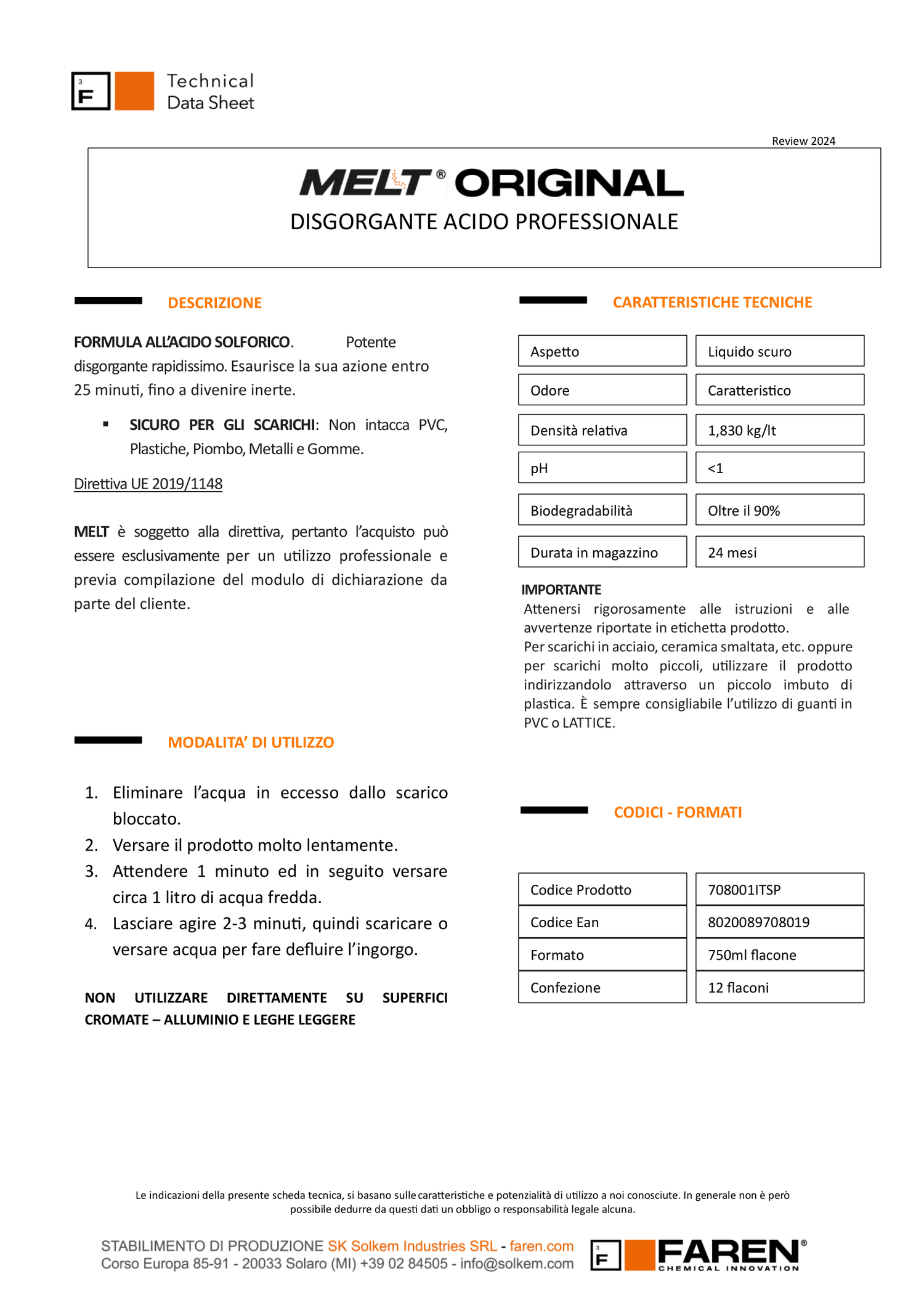 Faren MELT Disgorgante professionale a base di acido solforico 750ml (Confezione da 12pz)