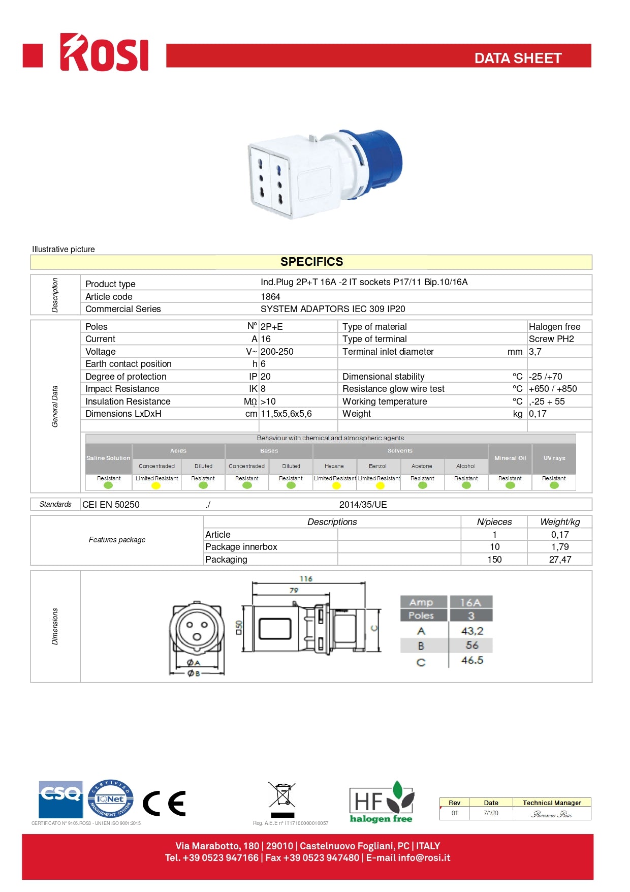 Industrial adapter plug CEE 2P+E 16A - 2 sockets 16A 220V ROSI