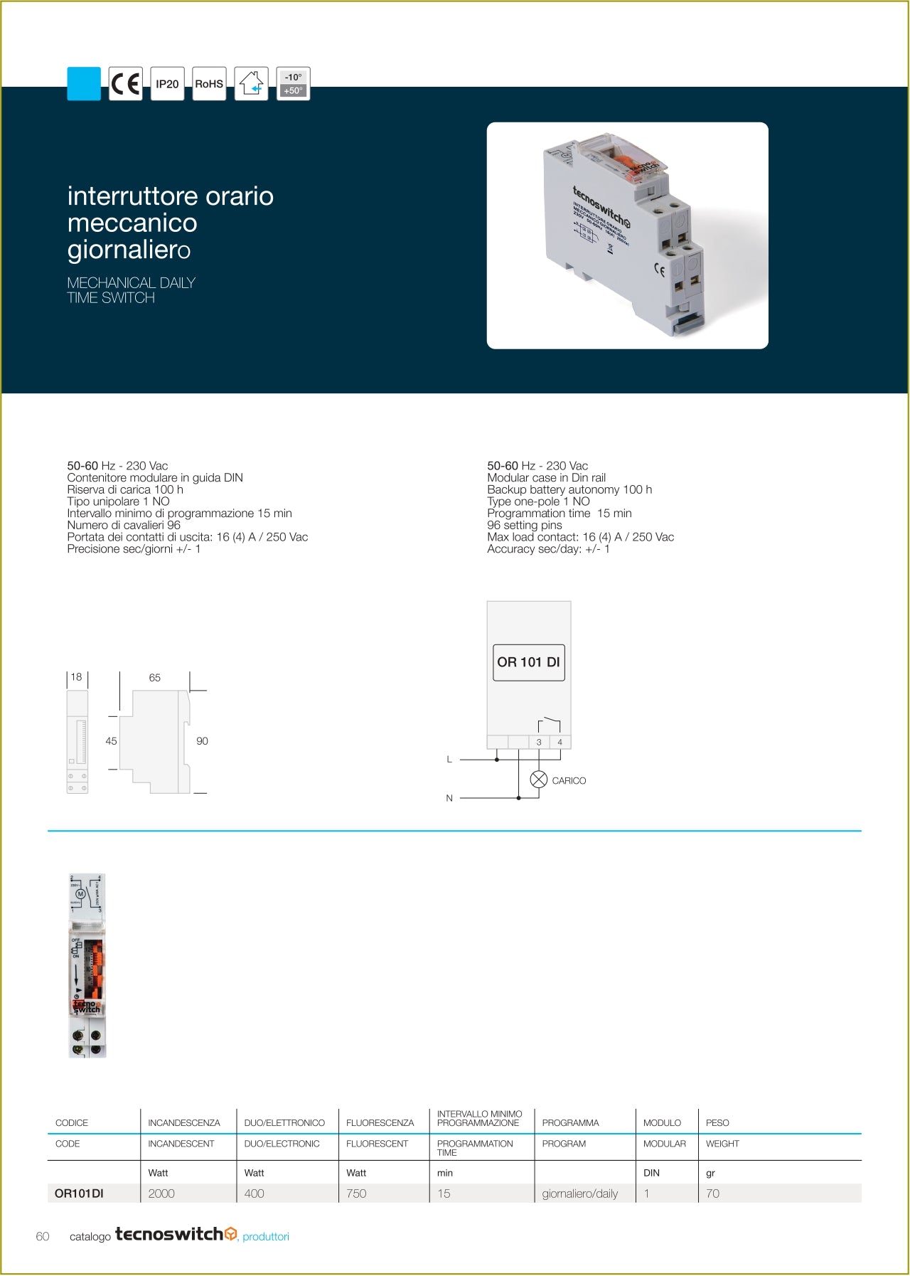 Daily mechanical time switch 1 din 50-60Hz – 230Vac Modular container in DIN rail Power reserve 100 hours Unipolar type 1 NO Minimum insertion time 15 minutes Number of riders 96 Capacity of the output contacts: 16 (4) A / 250 Vac Preasone sec/days 1 ,5 CODE: OR101DI Downloads Catalog page Quick instructions.IT