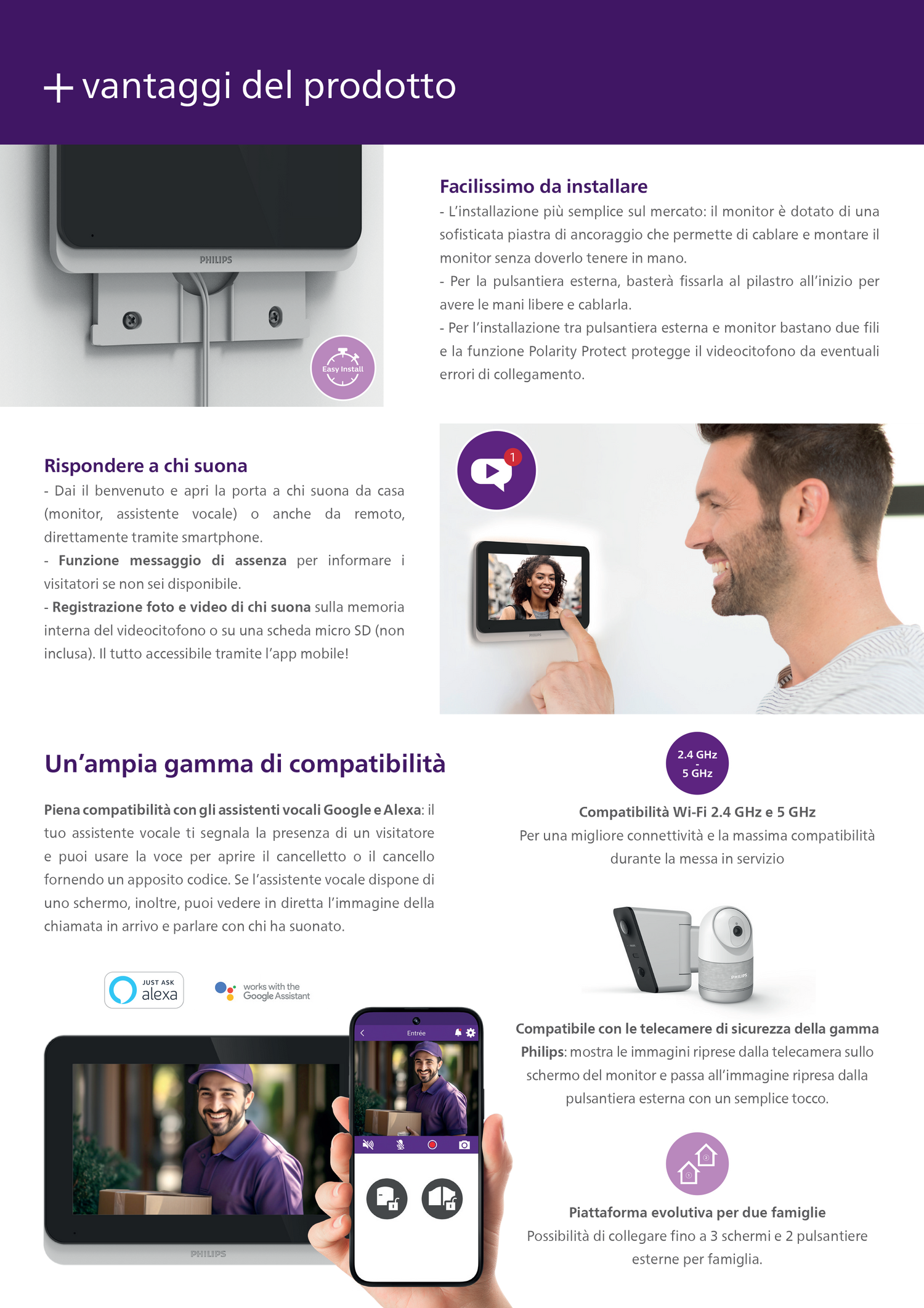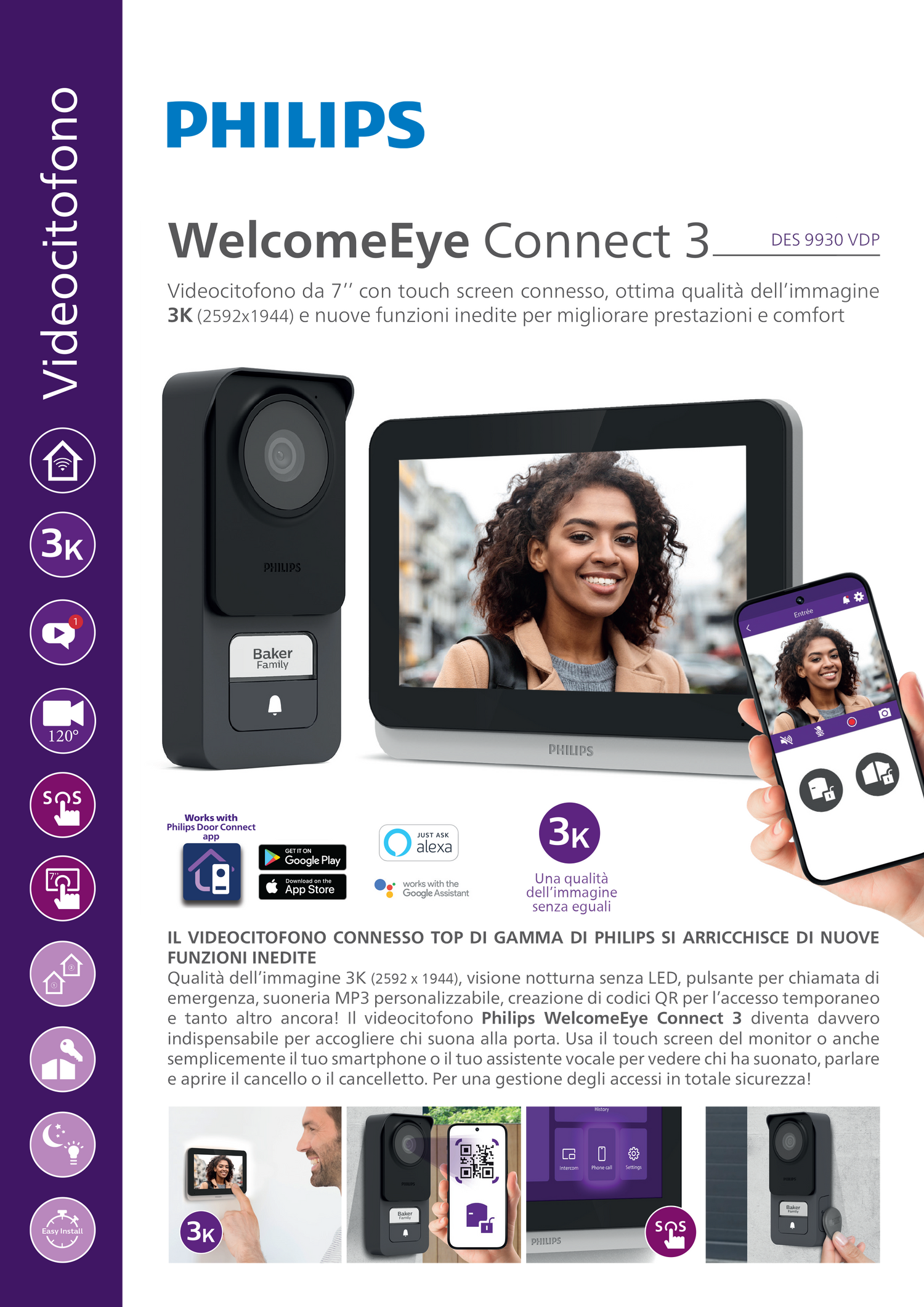 Qualità dell’immagine 3K (2592 x 1944) , visione notturna senza LED, pulsante per chiamata di emergenza, suoneria MP3 personalizzabile, creazione di codici QR per l’accesso temporaneo e tanto altro ancora! Il videocitofono Philips WelcomeEye Connect 3 diventa davvero indispensabile per accogliere chi suona alla porta. Usa il touch screen del monitor o anche semplicemente il tuo smartphone o il tuo assistente vocale per vedere chi ha suonato, parlare e aprire il cancello o il cancelletto. Per una gestione degli accessi in totale sicurezza!