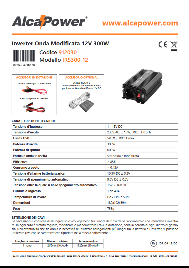 Alarm and automatic shutdown for low battery, over voltage, short circuit and overheating.