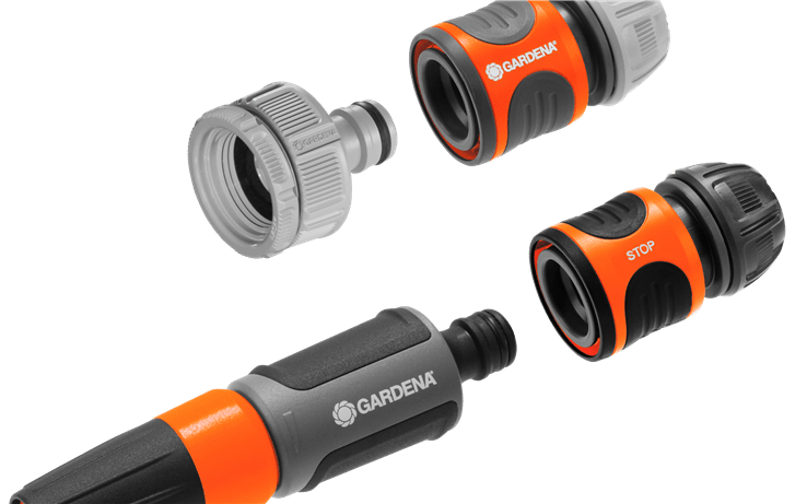Komfort-FLEX-Schlauch, komplett mit Original GARDENA Systemzubehör: 1 x Hahnarmatur 18222, 1 x Adapter 5305, 1 x Schnellarmatur 18215, 1 x „Water-Stop“-Armatur 18213, 1 x Classic-Lanze 18300