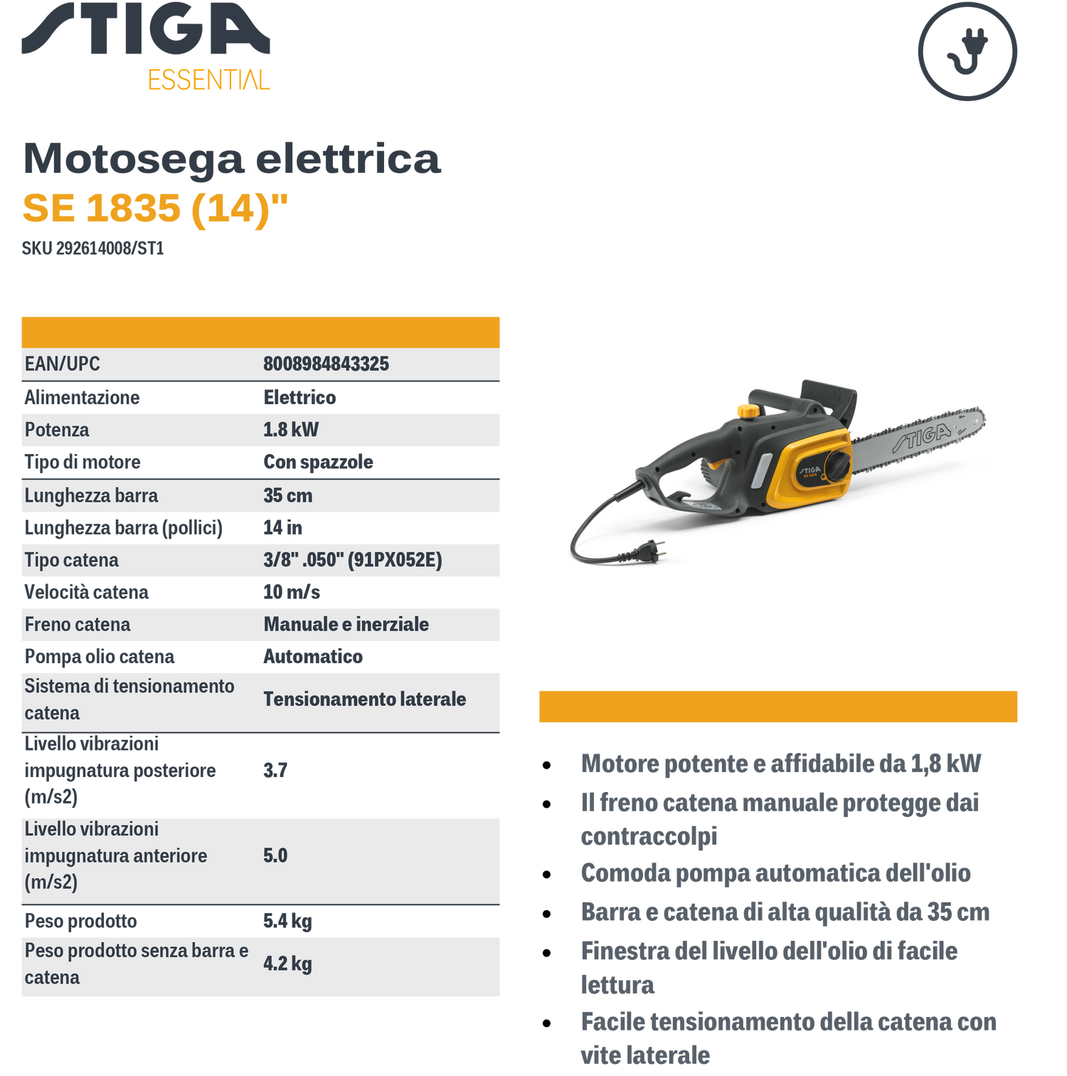 STIGA 1800W electric saw - SE 1835 - 35cm bar is backordered and will ship as soon as it is back in stock.
