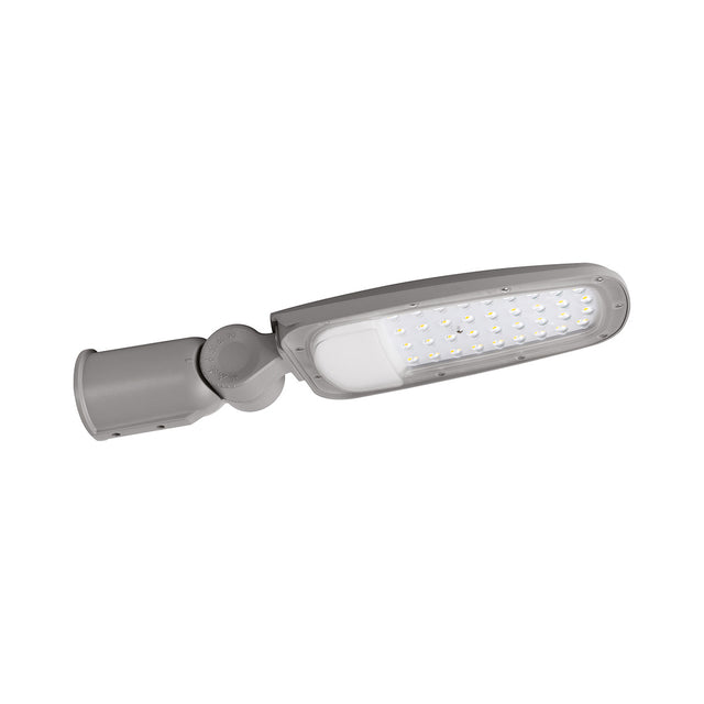 Armatura stradale. Struttura in alluminio pressofuso. Finitura in grigio opaco. Attacco al palo con inclinazione regolabile in alluminio pressofuso idoneo per pali di diametro 62mm. Diffusore in metracrilato trasparente. Modulo LED e trasformatore inclusi.