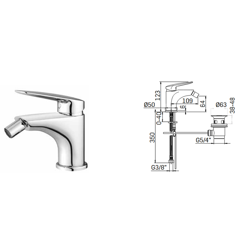 Miscelatore monocomando per bidet con scarico, finitura Cromo Miscelatore monocomando per lavabo con piletta da 1-1/4” Contenuto della confezione Rubinetto  Piletta da 1-1/4''con salterello  2 x flessibili da 3/8'' da 40cm sporgenza 110 mm.altezza totale 123 mm.altezza base - aeratore 64 mm.foro di installazione Ø35 mm.tubi alimentazione flessibili G.3/8”scarico da G.5/4”Ricambi: cartuccia Ø35 a dischi ceramici art. 19M Scheda tecnica disponibile qui