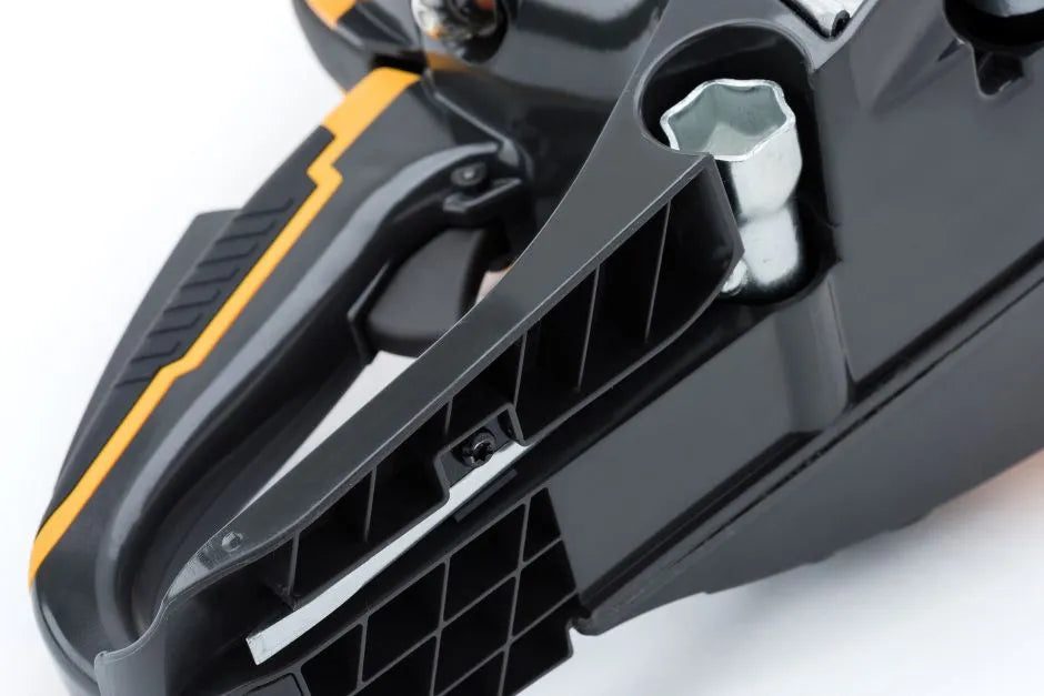 Chain brake integrated in the engine casing. Bar cover with double stud, stud nuts with internal stop that do not allow them to slip out of the cover when we remove it to change the chain. No more losing slash dice in the grass when changing chain!