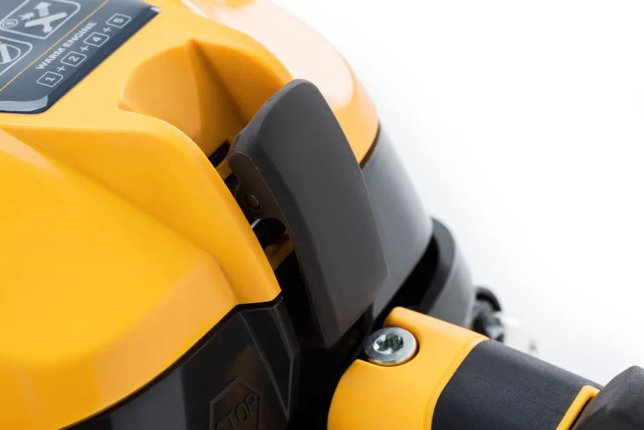 "Always On" type switch. It is a switch with return spring which, once pressed to zero to switch off the machine, returns to the ON position by itself. This avoids flooding the machine by pulling the self-winding cord having left the switch in the OFF position by distraction. Soft Grip and Soft Touch ergonomic rear handle, wide base of the rear handle to facilitate starting with the machine on the ground.