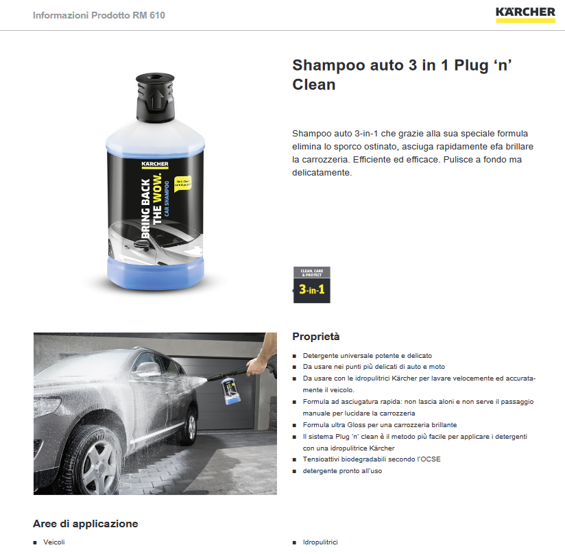3-in-1-Reinigungsshampoo für Autos und Motorräder für Hochdruckreiniger – KARCHER RM610 Das Reinigungsshampoo von Karcher entfernt dank seiner speziellen Formel hartnäckigen Schmutz, trocknet schnell und lässt die Karosserie glänzen. Reinigt gründlich, aber schonend. Speziell für Karcher-Hochdruckreiniger