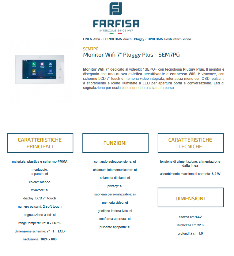 Monitor Wifi 7" Pluggy Plus - SEM7PG FARFISA ...è stato ordinato al fornitore e verrà spedito non appena sarà di nuovo disponibile.