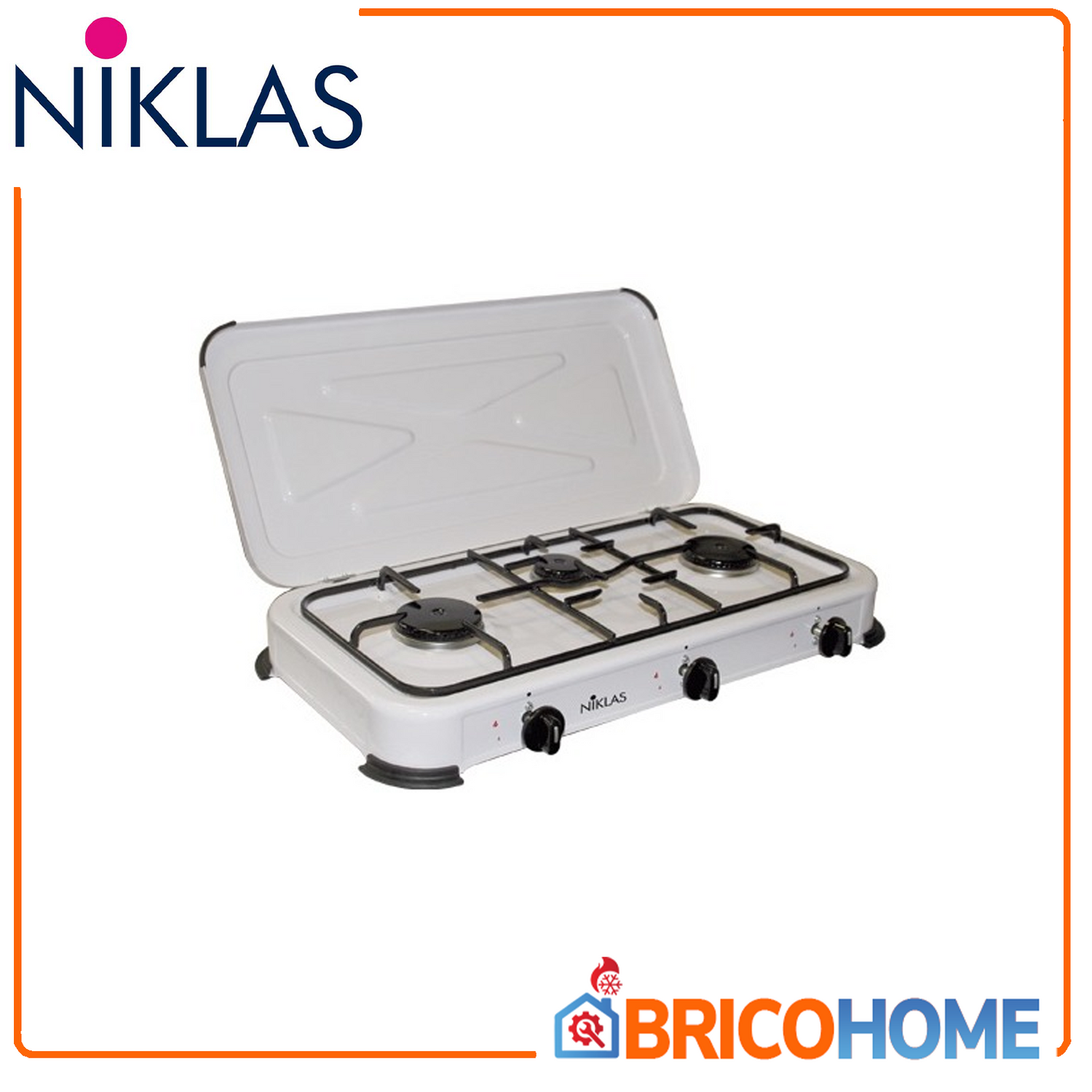 Fornello a Gas 3 Fuochi in Acciaio Porcellanato con Coperchio Ribaltabile ed Estraibile 56x29x11 cm colore Bianco