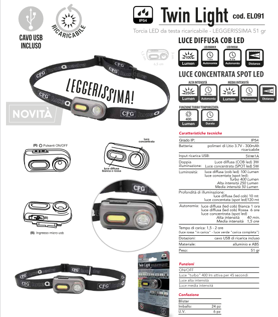 Torcia ricaricabile da testa 400 lumen - TWIN LIGHT