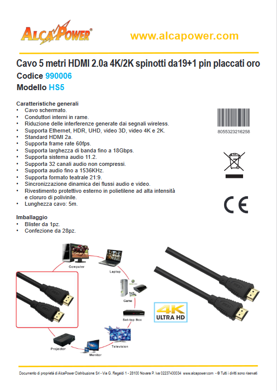 Cavo HDMI 2.0a - 4K-2K Spinotti 19+1 pin Oro 5m  - ALCAPOWER