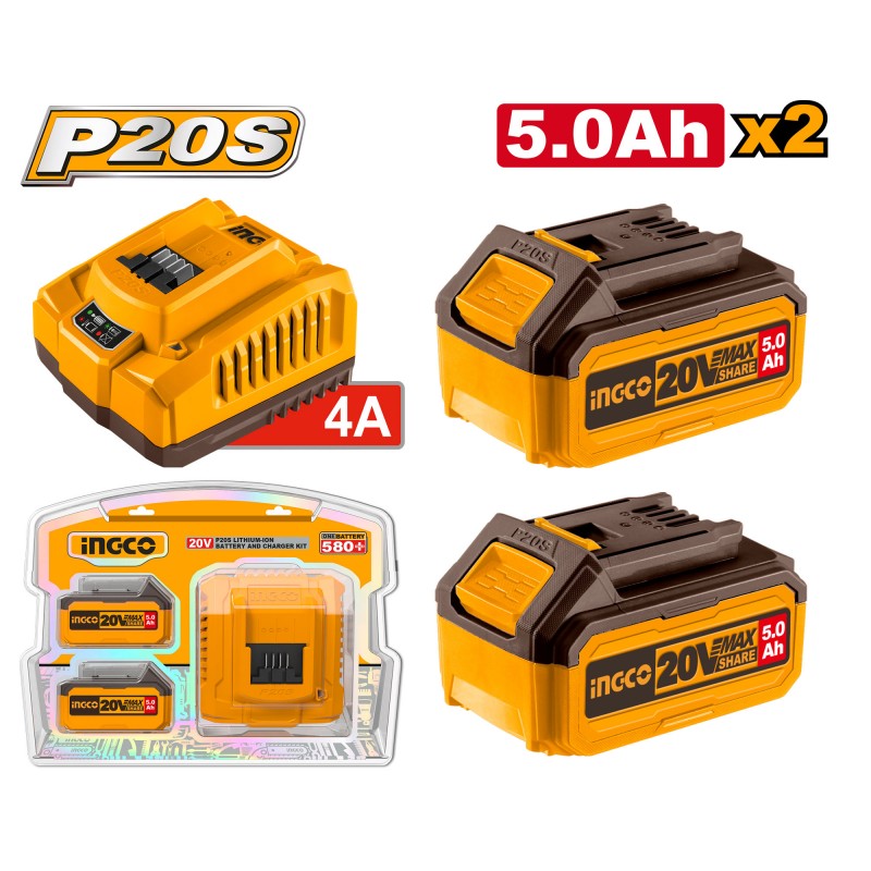 INGCO Kit starter 2 batterie da 5Ah + caricabatteria rapido 4Ah (FBLI2003 + FCLI20411E)
