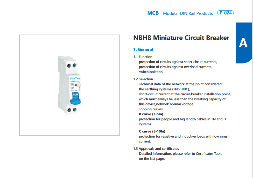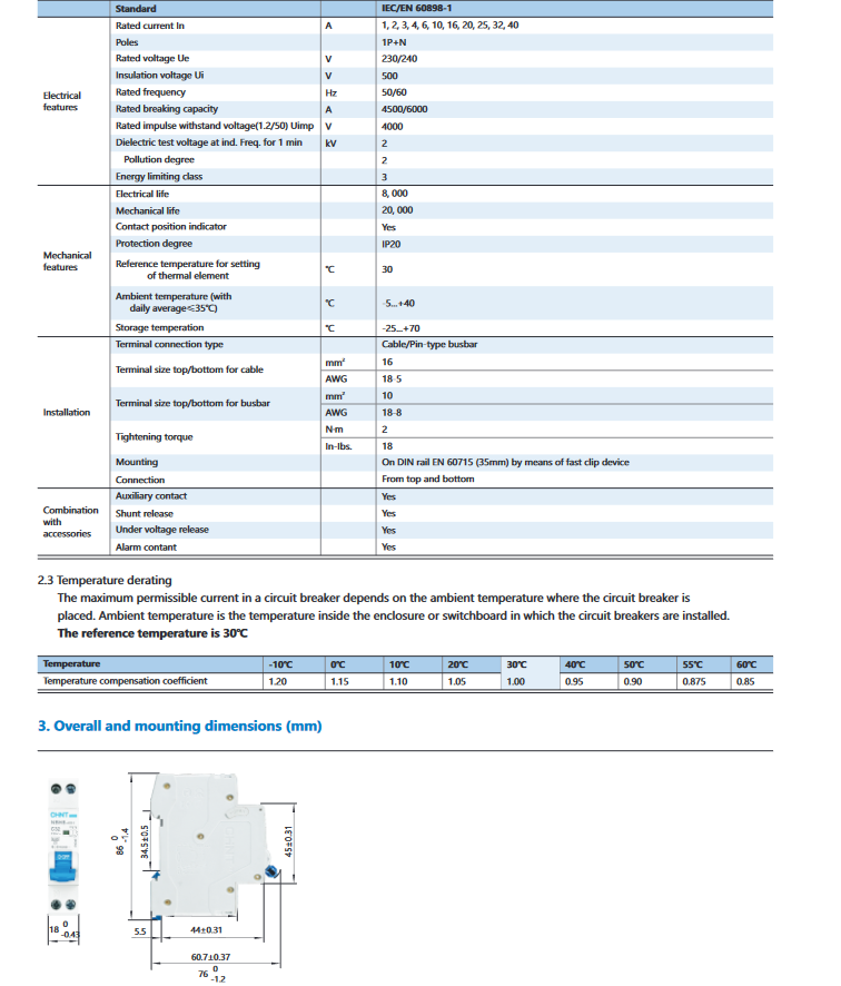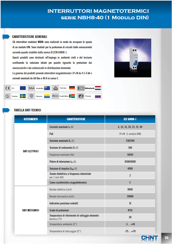 Interruttori magnetotermici compatti serie NBH8-40/1PN-4,5, progettati per occupare lo spazio di un solo modulo DIN. Idonei per la protezione dei circuiti dalle sovracorrenti e particolarmente indicati per la protezione dai sovraccarichi e dai cortocircuiti in distribuzione terminale. Disponibili in versione 1P+N con potere di interruzione nominale (Icn) 4,5 kA e correnti nominali (In) da 4 a 40 A in curva C. Tensione nominale 230 V. Accessoriabili con contatti ausiliari, contatti di allarme, bobina di sgancio e bobina di minima tensione.