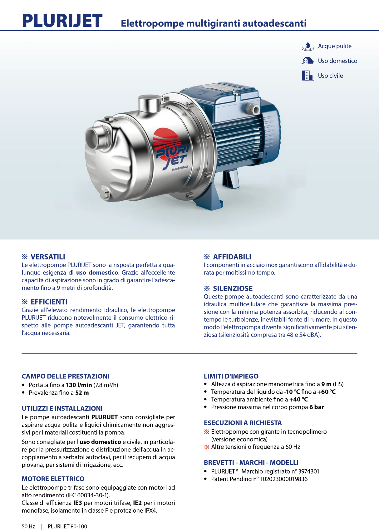 Le pompe autoadescanti PLURIJET sono consigliate per aspirare acqua pulita anche in presenza di aria miscelata al liquido pompato e liquidi chimicamente non aggressivi per i materiali costituenti la pompa. Per la silenziosità, l’affidabilità e il basso consumo energetico, sono consigliate per l’uso domestico e civile, in particolare per la pressurizzazione e distribuzione dell’acqua in accoppiamento a serbatoi autoclavi, per il recupero di acqua piovana, per sistemi di irrigazione, ecc. L’installazione è da effettuarsi in luoghi chiusi ben arieggiati o comunque protetti dalle intemperie.