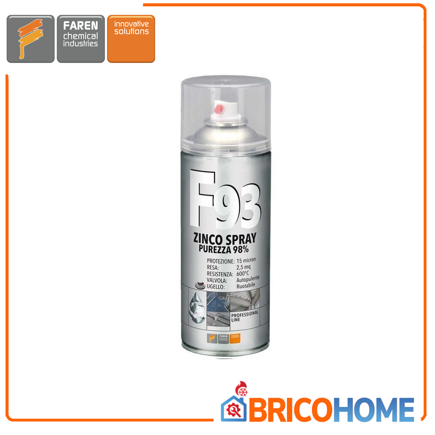 Zinco spray zincante freddo professionale Faren F93 ml 400 A base di polvere di Zinco lamellare micronizzato puro oltre il 98% e miscelato con polvere lamellare di alluminio (per dare il colore chiaro). Garantisce una protezione alla corrosione e alle ossidazioni che dura nel tempo anche in ambienti esterni.   - PERFORMANCE:15 micron di protezione – Resiste a 600°C – 2,5 mt di resa a bombola. - RAPIDO: Fuori polvere è lavorabile dopo 180 secondi. - PRATICO: Ugello ruotabile per erogare sia in verticale che in orizzontale.   Consigli per l’uso Dotato di speciale valvola a 360° che garantisce la...