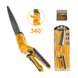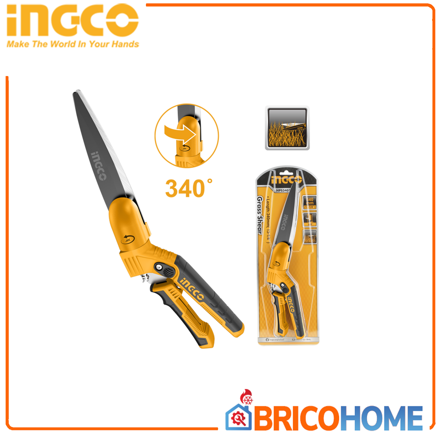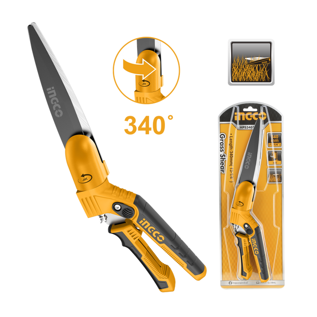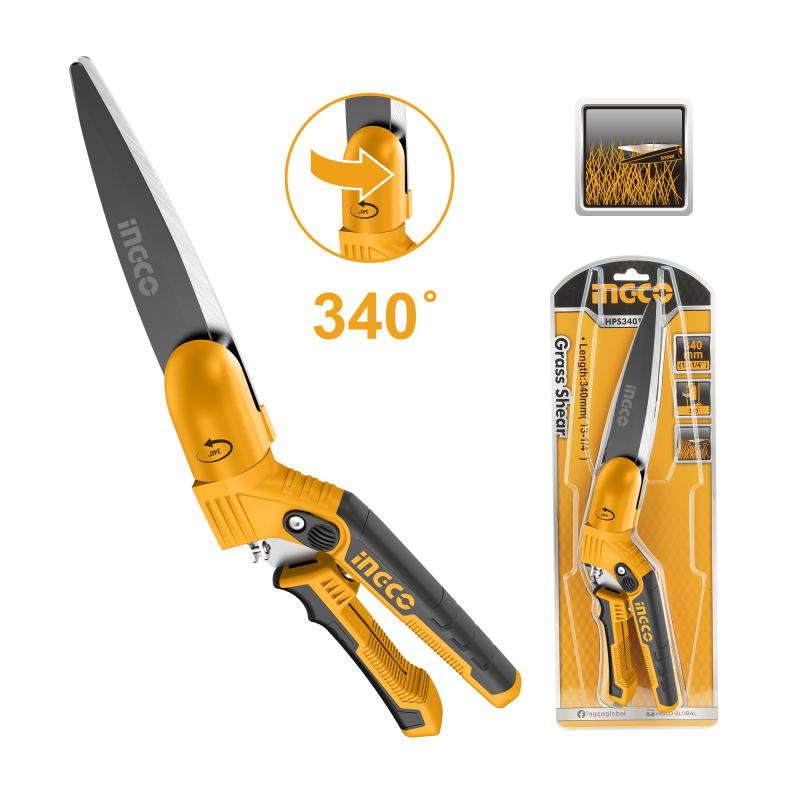 340°-Grasschere Größe: 13-1/4"/340mm Klingengröße: 7"/180 mm Nettogewicht: 315 g Wärmebehandlung mit Antihaftbeschichtung ABS-Griff mit TPR-Griff In Blistern verpackt