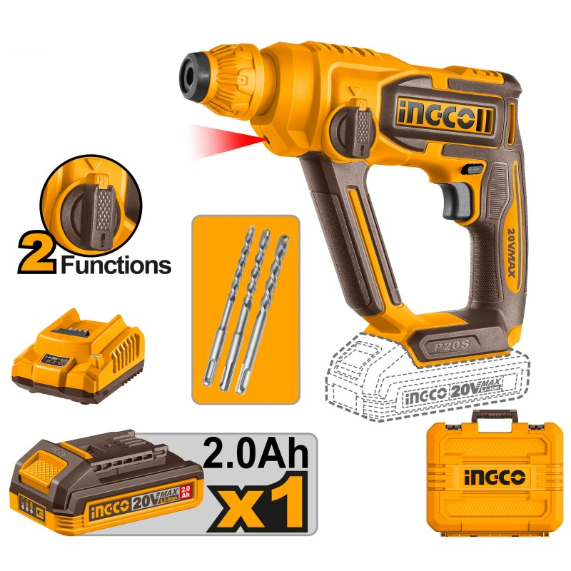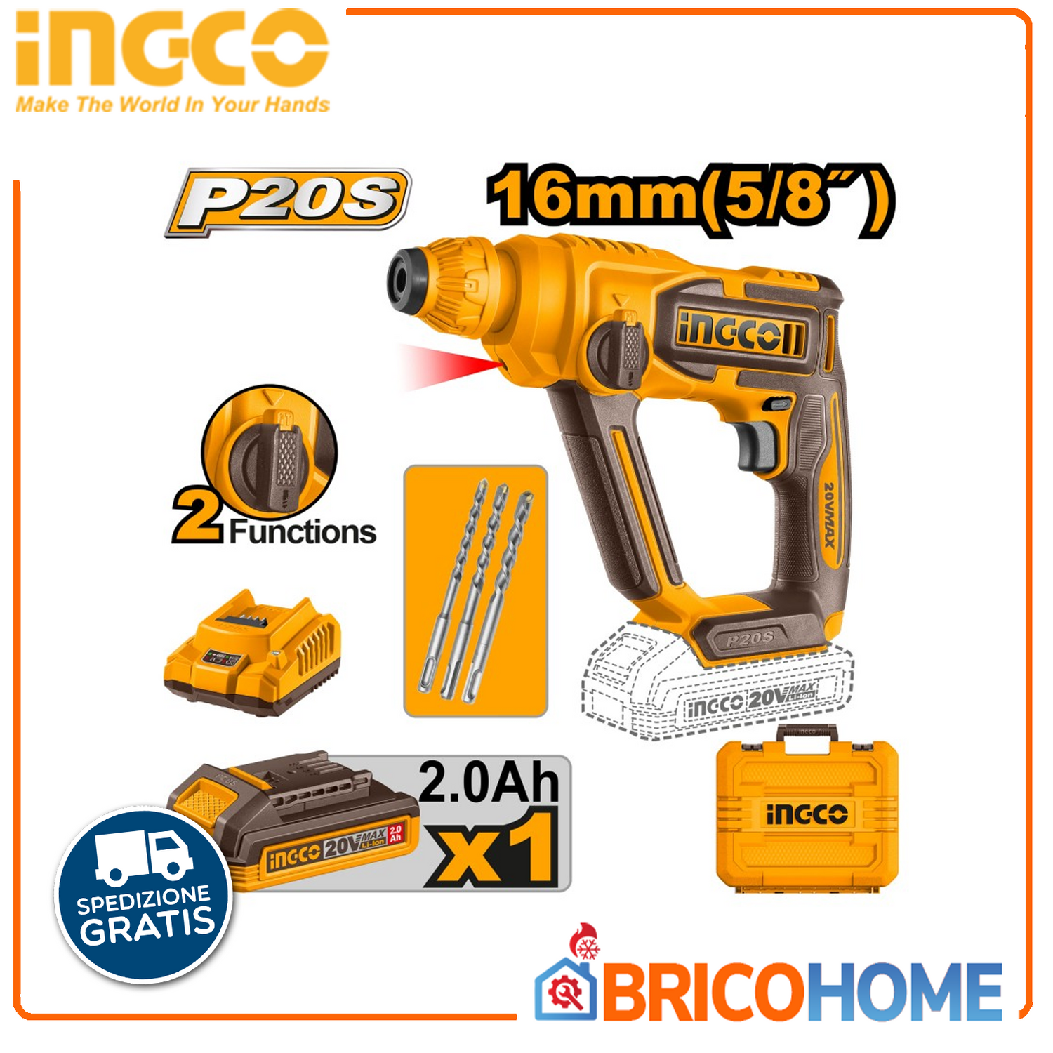 INGCO Martello tassellatore 20V SDS-Plus con 1 batteria da 2Ah e caricabatteria in valigetta